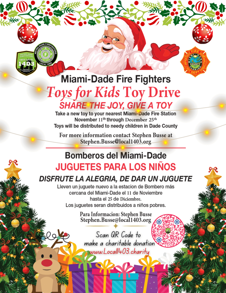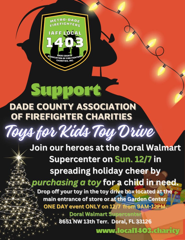 With the support of Walmart’s Sparks Good grant funds, Shop, Drop & Roll with a Firefighter brings together firefighters and cadets from Miami-Dade Fire Rescue to help children in need shop for toys and spread joy during the season of giving. Additionally, from mid-November till December 25th, firefighters, businesses, and residents are encouraged to donate new and unwrapped toys to any Miami-Dade Fire Rescue fire station for the annual Toy for Kids Toy Drive benefiting many children in need throughout Miami-Dade County.